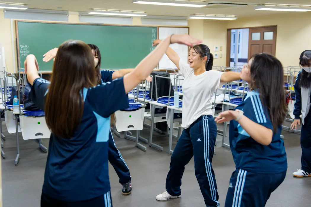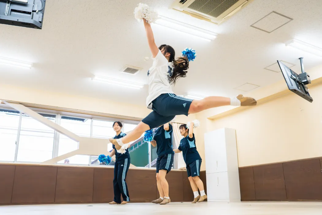 ダンス部は全国大会出場を目指し、日々練習に取り組んでいます。普段の練習は基礎練習や筋トレをしたり、コーチに週1回来ていただき、大会の振り入れをしたりしています。学年、コース関係なくみんなで切磋琢磨し、楽しく部活動を行っています。また、お互いにアドバイスを出し合いながら一人一人実力を向上させ、みんなで目標達成ができるように頑張っています。