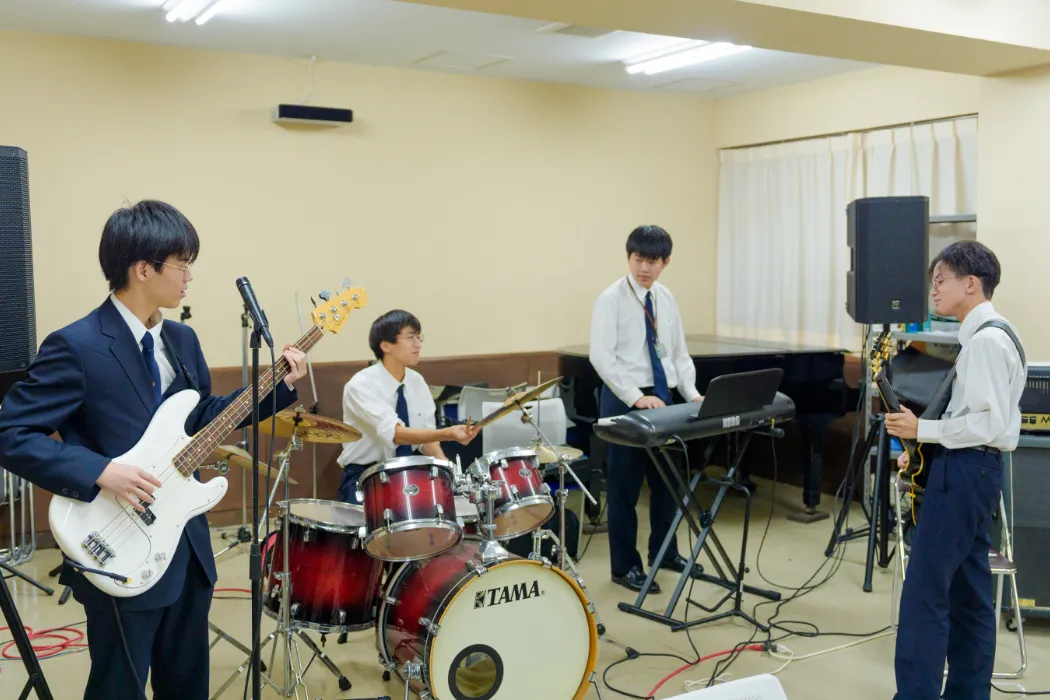 この部活は、部内でバンドを組み演奏する部活です。主に、10月に行われる世界教室や、校内のライブイベントなどに向けて日々練習しています。部員はフレンドリーな子か多く、学年や科コース間の壁がない事が強みです。楽器初心者の方も大歓迎です。音楽を通して、一緒にKANTOを盛り上げていきましょう!