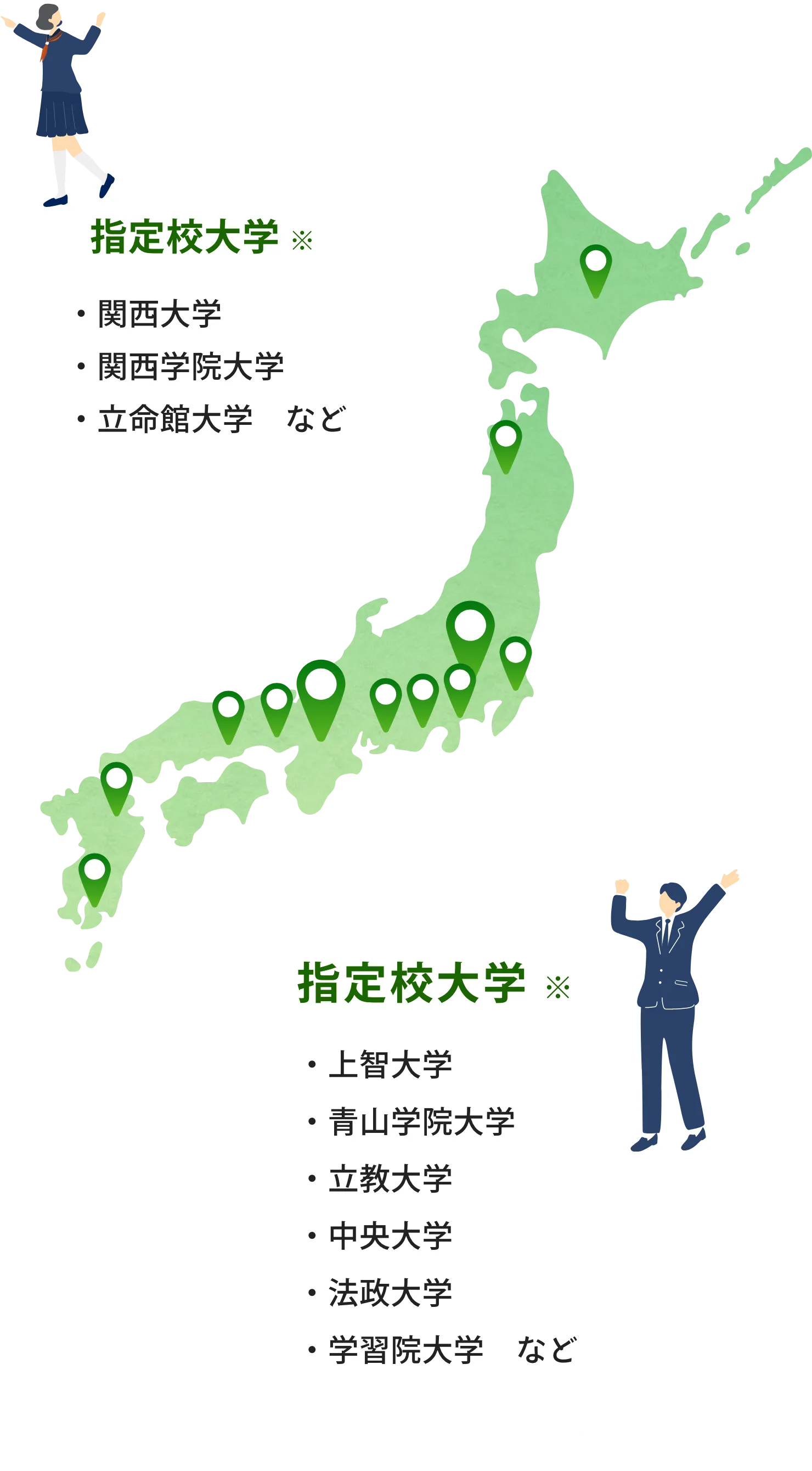 KANTOでは生徒への進路指導を、入試対策の明確なビジョンを持って行っています。いわゆる、模擬試験の結果から得る偏差値をもとに、受験大学(学部)を選ぶのではなく、高校での学びを活かし、将来の希望へとつながる「本当に目指すべき」大学を進路目標としています。本校では生徒の希望する進路の実現を目指し、指定校推薦枠を豊富に設け、小論文授業や、高大連携ブリッジ授業、英検対策授業で生徒たちの学習をサポートしています。