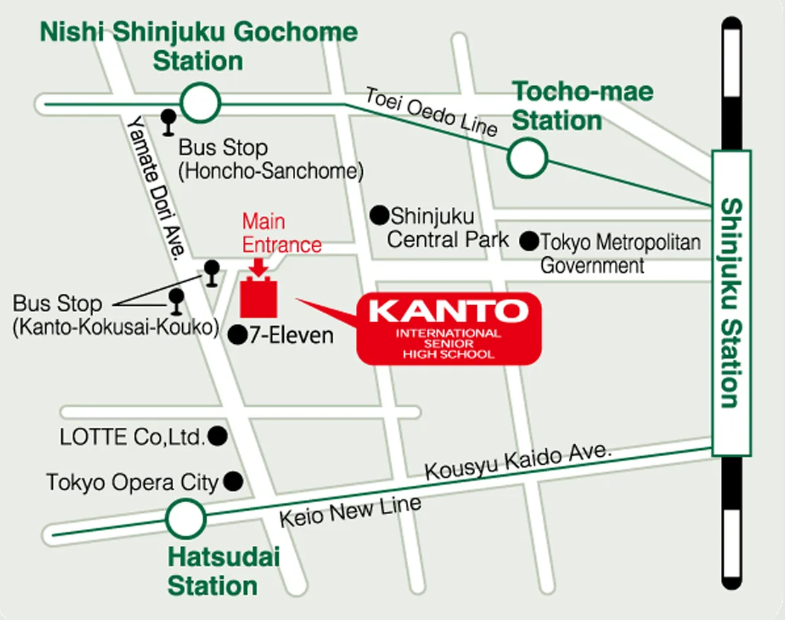 - Keio Teito Bus No. 64 (Nakano Station via Nakano Sakaue) and disembark at the Kanto International Senior High School bus stop. The school is a 1-minute walk.
