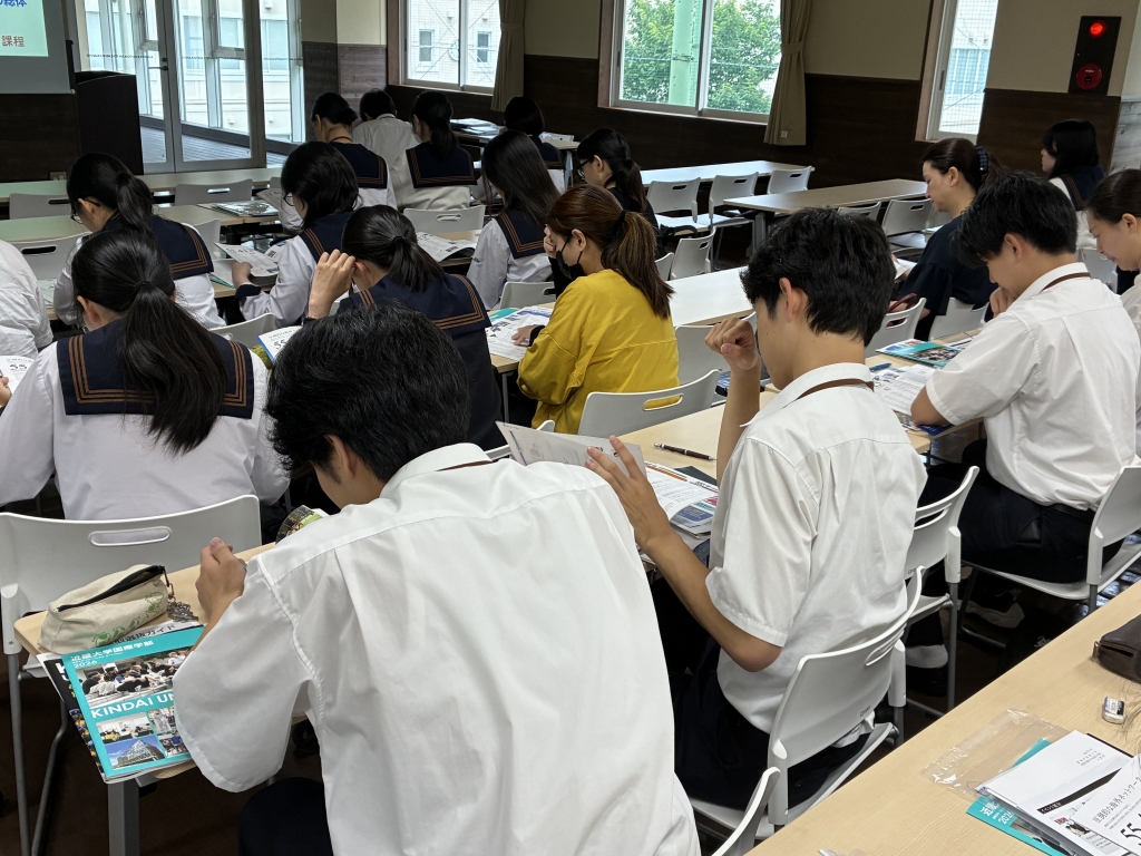 6月9日(月)本校にて、「関西地区2大学説明会」を実施しました。関西外国語大学(大阪)と近畿大学(大阪)の先生にお越しいただき、大学や学部の詳細、留学プログラム等について直接ご説明いただきました。いずれの大学も国際理解や異文化理解、言語研究等の学びに力を注がれており、豊富な留学プログラムが準備されています。生徒にとって大変有意義な時間となりました。