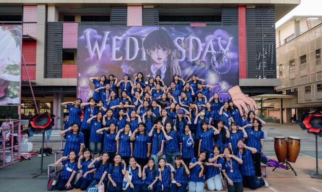 2つ目は11月の終わりに行われた運動会です。私がタイで通っているケマシリメモリアルスクールの運動会は、紫、ピンク、緑、黄の4色にチームが別れ、様々な競技を行います。また、チーム毎に自分たちのチームカラーにあったテーマを決めそれに合わせた衣装を用意したり演劇を行ったりもします。私が入った紫チームは、映画「ウェンズデー」がテーマでした。披露された演劇はとてもクオリティが高く感動しました。