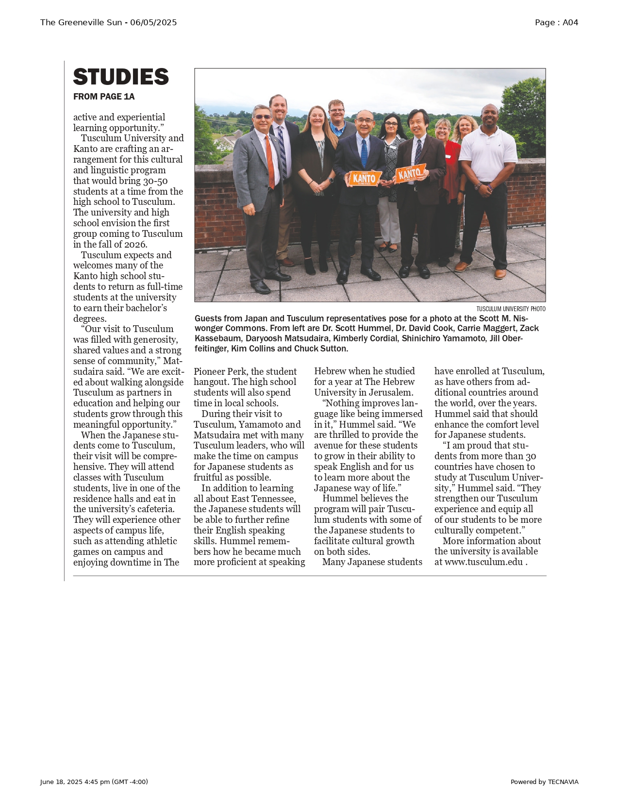 「歴史ある美しいキャンパスに松平氏と山本氏をお迎えできたことを大変嬉しく思います」と、Tusculum大学のスコット・ハメル学長は語りました。「この連携は、両校の学生にとって互いの社会や文化について学び合う素晴らしい機会となり、実践的な学びを提供するものになると確信しています。」